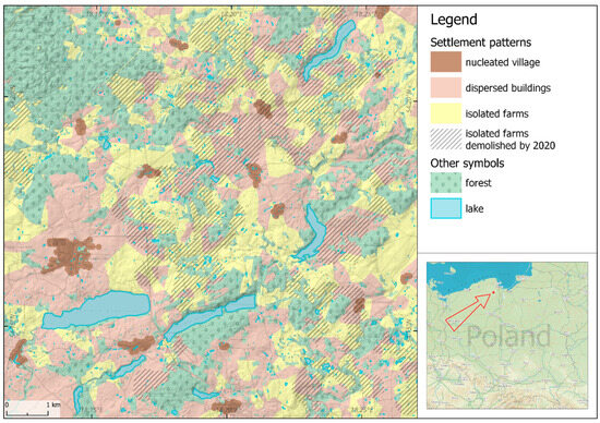 The research subject comprises the distribution of dispersed family-run farmsteads or hamlets (that consist of several farmsteads) located outside compact villages and erected before 1937. The map content analysis in QGIS (Figure 4) includes the following: