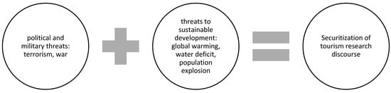 It is necessary to emphasize the connections between the influence of current security policy and the growth of securitization discourse in biological and geographical sciences [30,31,32]. It should be recognized that the lack of formal terminology specific to security studies or political science does not mean that the authors of the research are not anchored in the securitization discourse. It seems that over the last 5 years, there has been a trend toward shifting the research discourse in the fields of tourism and sustainable development toward a securitization narrative. This is evidenced not only by the fact that publications are created containing keywords such as security sector of tourism or security of sustainability. The process of broadening the perception of security threats in its classical approach to include research areas of natural sciences becomes unmissable. In the discussed case, we can talk about the involuntary or unconscious securitization of the research discourse in the field of tourism or sustainable development (Figure 1).