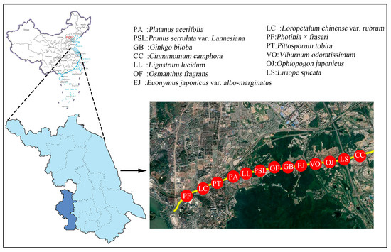 Nanjing City is located in the southwestern part of Jiangsu Province, China, in the middle of the fertile region downstream of the Yangtze River. Its geographical coordinates range from 31°14″ to 32°37″ north latitude and 118°22″ to 119°14″ east longitude [34]. Nanjing City has distinct seasons and abundant rainfall in the North Subtropical Humid Climate Zone. The period from late June to early July is the rainy season in Nanjing City. The annual average temperature in Nanjing City is 15.4 °C, with the highest extreme value of 39.7 °C and the lowest extreme value of −13.1 °C. For this study, Xuanwu Avenue, one of the key construction projects in Nanjing City, was selected as the research object (Figure 1). Xuanwu Avenue is a typical urban traffic artery with an asphalt roadway, located in the main urban area of Nanjing, with a large flow of people and vehicles, and once ranked second in Nanjing with an average daily traffic volume of 131,000 vehicles. It is a road with serious automobile exhaust pollution in Nanjing, and at the same time, the surrounding areas are mostly commercial areas, residential areas, and schools, which reduces the diffusion of atmospheric particulate matter to a certain extent.