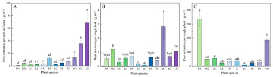 Dust retention per unit leaf area (A), per single leaf (B), and single plant of different plants (C). Different lowercase letters indicate significant differences in dust retention per unit leaf area (A), per single leaf (B), and single plant of different plants (C) among various species at the 0.05 level. PA (P. acerifolia); PSL (P. serrulata var. Lannesiana); GB (G. biloba); CC (C. camphora); LL (L. lucidum); OF (O. fragrans); EJ (E. japonicus var. albo-marginatus); LCt (L. chinense var. rubrum); PF (P. fraseri); PT: Pittosporum tobira; VO (V. odoratissimum); OJ (O. japonicus); LS (L. spicata) (same below).