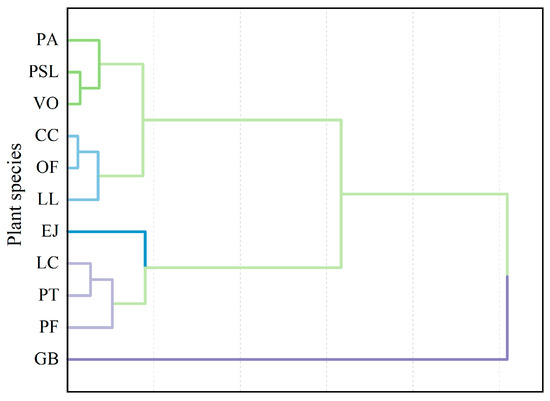 After conducting cluster analysis on the dust retention capacities of different tree and shrub units, we referred to Aliya Baidourela’s method [36] and refined the classification on its basis. Including unit leaf area dust retention capacity, single leaf dust retention capacity, and single plant dust retention capacity, the tested plants can be divided into five categories based on their comprehensive dust retention capacities (Figure 3). Category 1 includes VO, PA, and PSL with strong comprehensive dust retention capacity. Category 2 consists of LL, OF, and CC with relatively strong comprehensive dust retention capacity. Category 3 comprises EJ with moderate comprehensive dust retention capacity. Category 4 includes LC, PT, and PF with relatively weak comprehensive dust retention capacity. Category 5 consists of GB with weak comprehensive dust retention capacity.