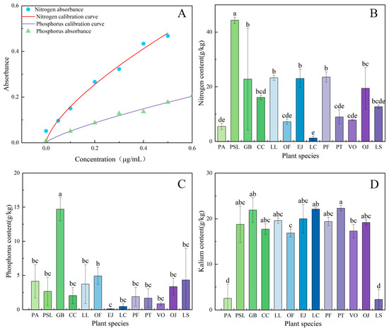 The working curves for nitrogen and phosphorus standard solutions (A), as well as the plant nitrogen (B), phosphorus (C), and potassium (D) content. Different lowercase letters indicate that the contents of nitrogen (B), phosphorus (C) and potassium (D) in leaves of different species were significantly different at the level of 0.05.
