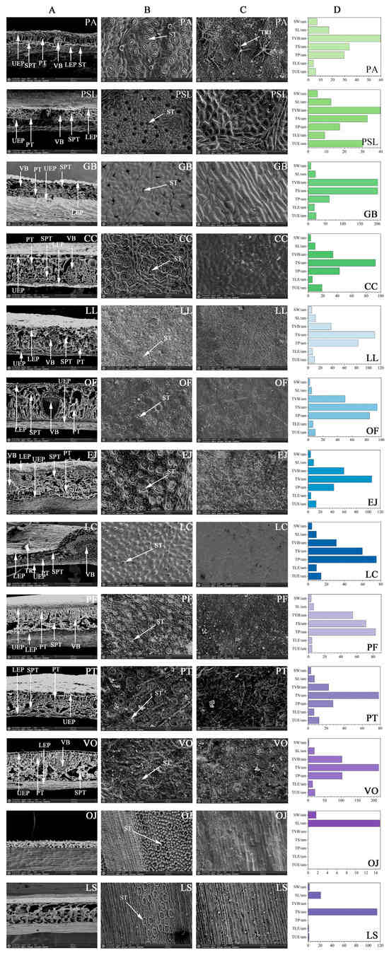 Electron microscope scanning of microstructures on leaf surfaces of 13 types of garden plants. (A) Leaf cross-section; (B) leaf stomata; (C) leaf surface; (D) plant microstructural parameters; UEP: upper epidermis; LEP: lower epidermis; PT: palisade tissue; SPT:s tissue; ST: stomata; VB: vascular bundle; TRI: trichomes. TUE: upper epidermis thickness; TLE: lower epidermis thickness; TP: palisade tissue thickness; TS: spongy tissue thickness; TVB: vascular bundle thickness; SL: stomata length; SW: stomata width; PA leaf is magnified 200 times, while the rest of the blades are magnified 500 times. The cross-section of the VO leaves is magnified 400 times, and the other leaves are magnified 200 times. The stomata are magnified 500 times.