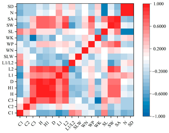 Correlation between dust retention of plants and various indicators. C1: dust retention per unit leaf area; C2: dust retention per leaf; C3: dust retention per individual plant; H: plant height; H1: crown height; D: crown width; L1: leaf length; L2: leaf width; L1/L2: leaf length–width ratio; SLW: specific leaf weight; WN: nitrogen content; WP: phosphorus content; WK: potassium content; SL: stomatal length; SW: stomatal width; SA: stomatal area; N: number of stomata within the field of view; SD: stomatal density.