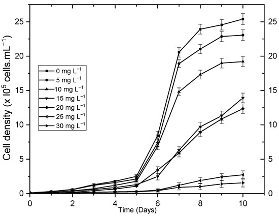 The tolerance of microalgae to heavy metals was evaluated by monitoring their growth across a range of Cr(VI) concentrations, spanning from 0 to 30 mg L−1. To prepare a 100 mg per liter Cr(VI) stock solution, 0.28 g of potassium dichromate (K2Cr2O7) was dissolved in one liter of bidistilled water. This stock solution was then diluted as required for the experiments, ensuring the pH level was controlled at a neutral value of 7, which matched typical environmental conditions. Elevated concentrations were intended to mimic the higher levels of tannery wastewater [26,27]. The same incubation conditions mentioned above were used for flasks. Cell densities and growth rates were measured to assess growth performance. Cell densities were used to calculate growth rates. Daily measurements of algal cell density were made with a hemocytometer Malassez cell. The toxic effect of Cr(VI) on microalgae was monitored using cell growth. The results of each experiment were performed in triplicate, and the median values with standard deviation are presented.