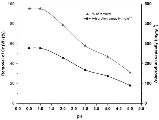 Because the biosorbent’s protonation determines the functional ion exchange sites and surface charge, the solution’s starting pH is critical for hexavalent chromium uptake [41] (Sibi, 2016). The pH also regulates the adsorbate’s charge. The microalgae contain hydrolyzable groups such as amines and aldehydes, as was discussed in the FTIR analysis. These two groups have more binding sites when acidified biomass and are easily protonated [42]. As a result, the pH of the solution was varied from 0.5 to 5.0 to study the influence of the initial pH on Cr(VI) adsorption while other parameters were kept constant. Different initial pHs were used to evaluate the Cr(VI) uptake effectiveness and capacity during the pH change experiment. Figure 2 illustrates the uptake capacity and efficiency plot with starting solution pH. At pH 1.0, the highest uptake capacity was 277.48 mg g−1. The pH increased consistently from 1.0 to 5.0, attaining 90.29 mg g−1 at pH 5.0.