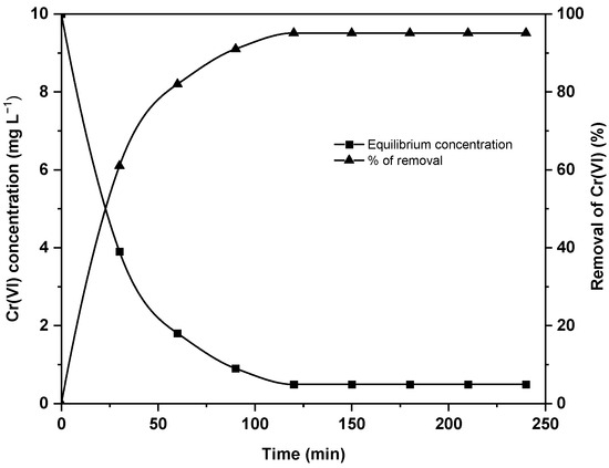Various contact times, ranging from 30 to 240 min, were conducted for the adsorption of Cr(VI) employing the C. subminuscula biomass while maintaining other constant parameters. The graph in Figure 3 illustrates the relationship between the contact time, the concentration of Cr(VI), and the percentage of its removal.