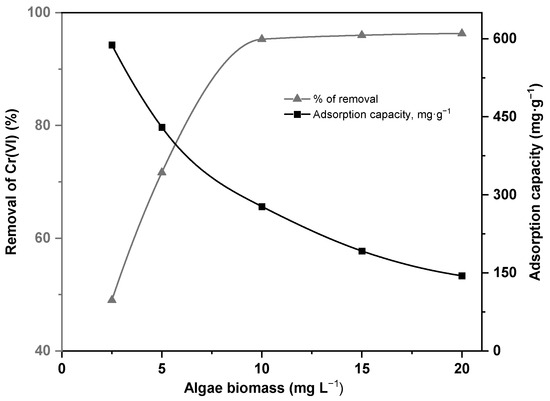 In contrast, the flat increase in the biosorption rate observed with biosorbent doses of more than 10 mg L−1 was due to incomplete aggregation of the biomass particles because of a reduction in the effective surface area [59]. Maleki et al. [32] reported that a generally decreased biphasic interface causes biosorbent overlap or aggregation. Therefore, a biomass alga of 10 mg L−1 was selected as the optimal biosorbent quantity for Cr(VI) uptake. The adsorption capacity gradually reduced from 588 to 144.45 mg g−1 with increased algae biomass from 2.5 to 20 mg L−1, respectively. The uptake rate decreased as the dosage of the algae biomass was increased (Figure 4), as determined by the quantity of hexavalent chromium uptake per gram of algae biomass (Equation (1)).