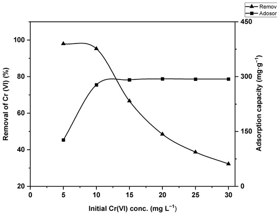 The starting quantity of Cr(VI) as an adsorbate is significant in controlling the uptake rate because biosorption is a physical mass diffusion process that occurs at the interface of two phases [58]. The curve in Figure 5 shows an initial rapid adsorption that gradually slows down, suggesting adsorption is controlled by a diffusion process, such as physical mass diffusion. Although the initial increase in Cr(VI) concentration (5–10 mg L−1) had no significant effect, the percentage uptake decreased from 98.3% to 95.3%. However, the starting Cr(VI) concentration rose from 10 to 30 mg L−1, progressively reducing from 95.3% to 32.26%. Therefore, the optimal initial Cr(VI) concentration was 10 mg/L. When the initial Cr(VI) concentration was raised from 5 to 10 mg L−1, the adsorption capacity doubled from 126.9 to 277.57 mg g−1. When the concentration was elevated further up to 30 mg L−1, practically nothing was modified. This could be due to a lack of binding sites in the microalgae to allow the growing quantity of Cr(VI) to diffuse, or their simultaneous contacts either restricted propagation of the two phases interface or their competitive attraction between them [61]. Bermdez et al. [59] suggest that the algal surface possesses a finite number of adsorptive sites. Upon saturation of these sites, further accumulation of Cr becomes unattainable.