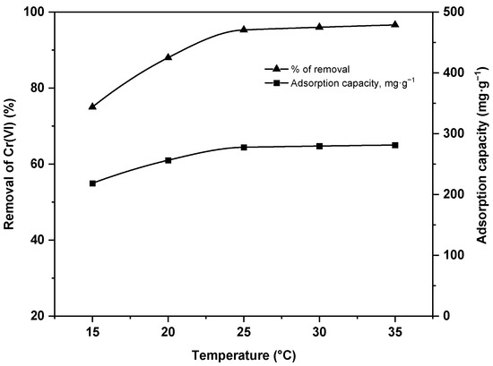 Effect of temperature on the Cr(VI) removal. (Conditions: initial Cr(VI) conc., 10 mg L−1; Algae biomass, 10 mg L−1; initial pH, 1.0; contact time, 120 min; Light intensity, 67.5 µmol·m−2·S−1).