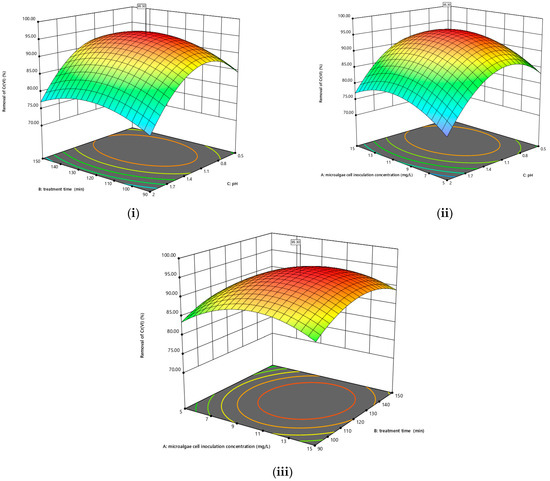 The effects and appropriate concentration of the three parameters for maximum Cr(VI) elimination efficiency were examined using a 3D response surface (Figure 7). The plots of the response surface illustrated the impact of each variable on the efficiency of chromium (VI) removal. By optimizing two factors and maintaining a third at its median z-axis value, we can observe their effects. In Figure 7i, you can see how the interplay between treatment duration (B) and pH level (C) unfolds when the biosorbent amount (A) is held constant at 10.91 mg L−1. The combination of pH (C) and treatment duration had a significant effect on Cr(VI) biosorption capacity (B). Among increasing pH and time, the Cr(VI) uptake capacity primarily increased and then reduced due to excessively low or high pH levels that may reduce microalgae’s ability to biosorbent metals [63].