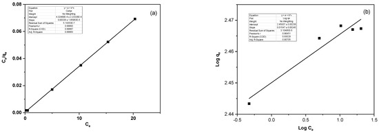 The value of RL was determined by applying the numbers for KL and C0 in accordance with the stipulated relationship (referenced as Equation (7)). This RL value is indicative of the adsorption process’s characteristics, signaling whether it is favorable (when RL is more than 0 but less than 1), linear (RL equals 1), unfordable (RL exceeds 1), or irreversible (when RL equals 0) [32].