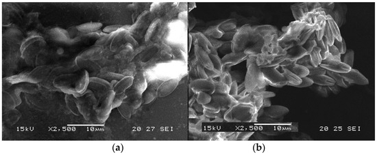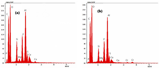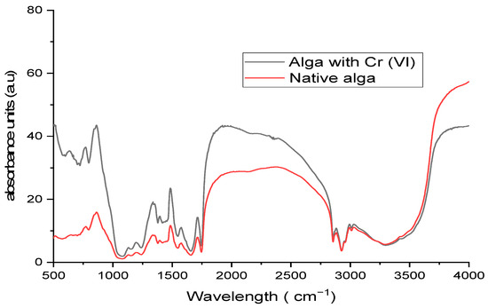 The functional groups in the biomass determine the kinetics of biosorption because it is a process that favors physisorption. Therefore, the functional groups on the diatom cell surface were examined using the Fourier Transmission Infrared (FTIR) spectrophotometer (Perkin Elmer FTIR-2000). Moreover, to analyze the algae subjected to Cr(VI) treatments from the experiments, FTIR (Fourier Transform Infrared Spectroscopy) assessments were conducted. For FTIR screening, pellets were prepared by blending 1 mg of the algal sample with 1 g of KBr in a 1:10 ratio. This mixture was then condensed into a solid form utilizing a bench press exerting 8 MT of pressure. The resulting FTIR spectra were recorded in the 500 to 4000 cm−1 [33]. Additionally, SEM-EDS (Scanning Electron Microscopy with Energy Dispersive X-ray Analysis) was employed to evaluate the changes in the microalgal biomass pre- and post-chromium treatment, utilizing an FEI Inspect F50 (FEI Instruments, Hillsboro, OR, USA) Inspect F50 scanning electron microscope equipped with an EDS detector for this analysis.