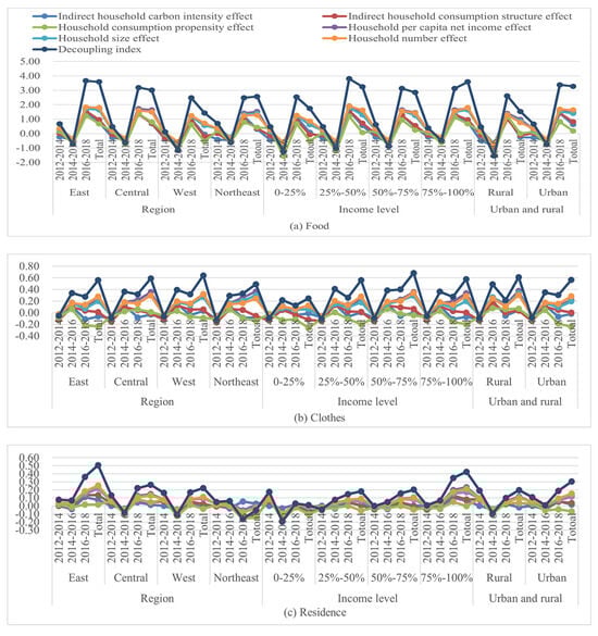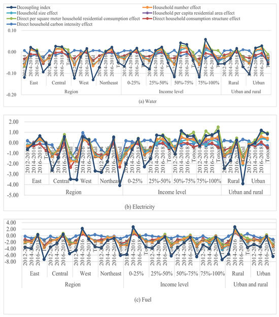 In Equation (7), are respectively the decoupling indexes of direct household carbon intensity, direct household consumption structure, direct household per square meter residential consumption, household per capita residential area, household size, and household number.