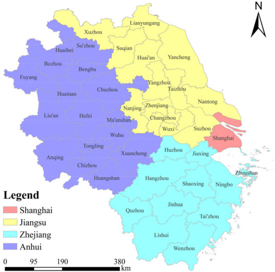 The YRD region consists of Shanghai, Jiangsu, Zhejiang, and Anhui (Figure 1), which feature the highest comprehensive strength and deepest embedding in economic globalization in China, with a highly developed export-oriented economy, accounting for 16% of the population, 24% of the GDP, and 42% of the total imports and exports in 2022, with 3.7% of the national territory. In the context of regional integration, the coordinated and balanced development characteristics of the YRD region are the most fully manifested. It is not only a well-developed urban agglomeration with a high level of interconnection but also a well-developed sub-level metropolitan area.