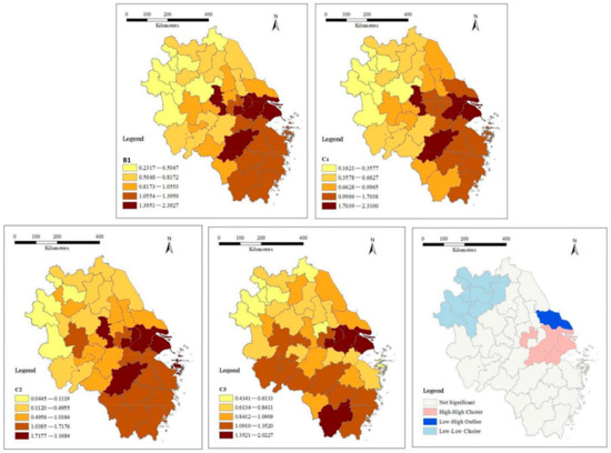 Lisa diagrams of the equilibrium index and its sub-divisions with spatial autocorrelation for 41 cities in the YRD region. ((Top left) distribution of equilibrium B1; (top right) distribution of people’s living standards C1; (bottom left) distribution of basic public services C2; (middle) distribution of basic public facilities C3; and (bottom right) Lisa chart of the equilibrium index.)