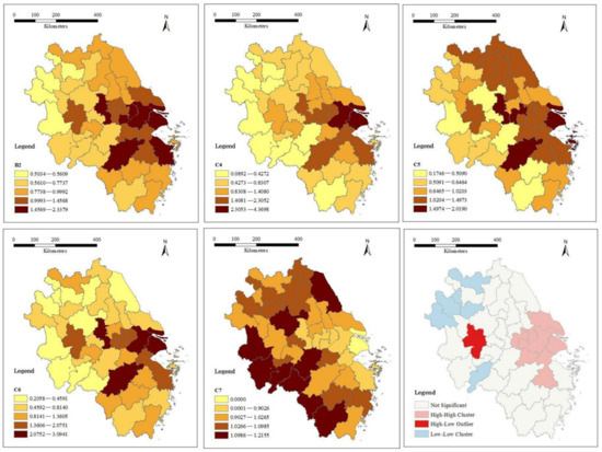 Lisa diagrams of coordination index and its subscripts with spatial autocorrelation for 41 cities in the YRD region. ((Top left) Coordination B2 distribution; (top middle left) industry coordination C4 distribution; (top right) town coordination C5 distribution; (bottom left) social coordination C6 distribution; (bottom middle left) human–nature coordination C7 distribution; and (bottom right) Lisa chart of coordination index).