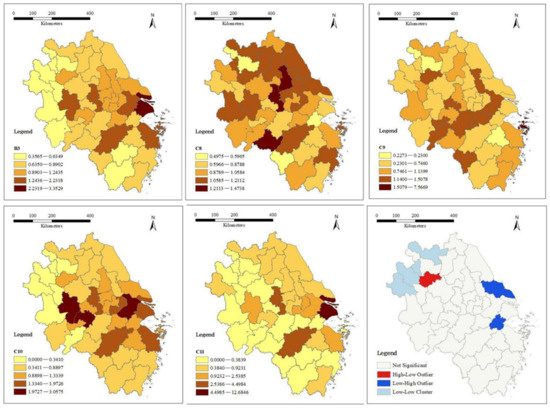 The top 10 cities among the 41 cities in the YRD region were Shanghai, Suzhou, Hangzhou, Wuxi, Nanjing, Ningbo, Zhoushan, Changzhou, Jiaxing, and Shaoxing, and the ratio between Jiangsu, Zhejiang, Shanghai, and Anhui was 6:11:1:2, with Zhejiang Province significantly outperforming the other 2 provinces. The results of the local spatial autocorrelation also reflect this trend, with high values extending from southern Jiangsu to Shanghai and Zhejiang, and low–low values in northwestern Jiangsu and northern Anhui (see Figure 2, the lower right Lisa diagram).