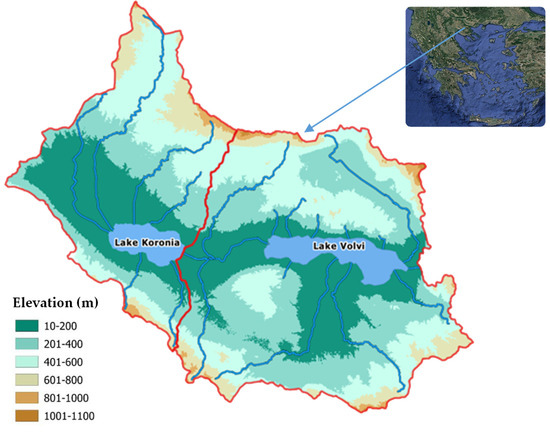 Lake Volvi is located in the water district of Central Macedonia, northern Greece. It has a surface area of 72.5 km2 and holds a water volume of 911 hm3 at the water level of 36 m a.s.l. Its average water depth is 12.5 m and its maximum depth is approximately 21 m. Lake Volvi is of tectonic origin [45], which explains its elongated shape, with a maximum length of 20 km and a width ranging from 2 to 6 km. At the beginning of summer, stratification of the lake commences (warm monomictic) [46], leading to anoxic conditions at the bottom, particularly in the deeper, eastern part of the lake. Lake Volvi outflows to River Richios, which in turn outflows to Strymonikos Gulf. Lake Volvi, along with neighboring Lake Koronia, is protected under the Ramsar Convention as a wetland of international importance (Lakes Volvi and Koronia | Ramsar Sites Information Service [47]). The lake also forms part of the National Park of Lakes Koronia-Volvi and Macedonian Temp. Their hydrological catchment drains an area of 2061 km2, while the sub-catchment area of Lake Volvi is 1293 km2 (Figure 1). The lake’s catchment is sparsely populated, with 31,059 inhabitants distributed across 30 small villages.