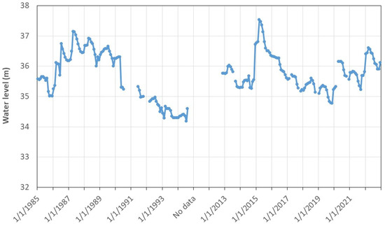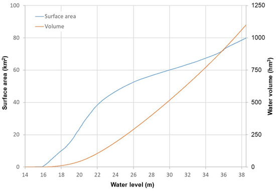 Morphological, hydrological and meteorological data for Lake Volvi are available at the Greek Biotope/Wetland Centre (website for Nature and Biodiversity—http://www.biodiversity-info.gr/ (accessed on 5 May 2023)) and Malamataris [53]. The morphology of the lake’s bottom is usually sufficiently expressed by the relationships between the lake’s water level, surface area, and stored volume (Figure 2). The quality of level–area–volume data is crucial for estimating the lake’s minimum level using a morphological or hydromorphological analysis, as well as to evaluate hydrologically the proposed environmentally minimum level. The water level in Lake Volvi fluctuates between 34.2 m and 37.5 m (a.s.l.), based on the data for the periods 1985–1994 and 2012–2021 (Figure 3). The minimum water level is usually observed during September–November, with an average value of 35.3 m, while the maximum level is observed in March–April, with an average of 36 m.