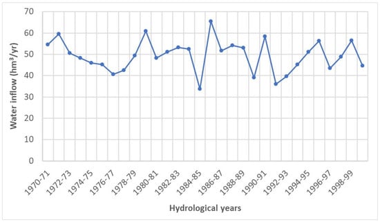 More specifically, to estimate the environmentally minimum water level in Lake Volvi, the lake’s water balance and the rainfall–runoff relationship in its hydrological catchment were studied for the period 2015–2019 using the MIKE HYDRO Basin model and the NAM rainfall–runoff model [64]. The accuracy of modelling results was mainly verified based on the measured lake’s water level. The above analysis found that the annual volume of surface water inflow to the lake from its hydrological catchment is estimated to be 7.5% of the volume of annual rainfall received by the lake’s catchment. The surface water inflow to Lake Volvi (Figure 4) was estimated for a period of 30 hydrological years (1970/1971–1999/2000), given that a long timeseries of a sufficient number of meteorological stations were available for this period [53]. It should be mentioned that the surface water inflow to Lake Volvi is the determinant parameter of its water balance, as has been confirmed by hydrological modelling and analysis. Then, the critical water volume was found as the median value of the time series data provided in Figure 4, and, afterwards, the minimum water level was estimated based on the water level–volume relationship given in Figure 2.