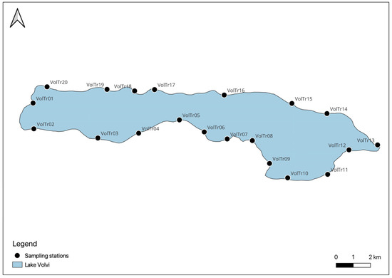 Distribution of the 20 sampling stations located in Lake Volvi, where habitat types and lake bottom granulometry were conducted. Samplings for macrophytes were conducted at stations VolTr02, VolTr03, VolTr04, VolTr05, VolTr08, VolTr10, VolTr11, VolTr15, VolTr17 and VolTr19. For benthic macroinvertebrates and fish, samplings were conducted at stations VolTr02, VolTr05, VolTr10, VolTr17 and VolTr19.