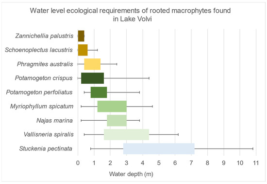 A recent vegetation survey of Lake Volvi in 2023 recorded the presence and estimated the abundance and positioning of 14 different taxa (in order of dominance: i. N. marina, ii. Phragmites australis, iii. M. spicatum, iv. C. demersum, v., S. pectinata, vi. V. spiralis, vii. P. perfoliatus, viii. Cladophora sp., ix. Z. palustris, x. S. lacustris, xi. Potamogeton crispus, xii. Lemna minor, xiii. H. morsus-ranae, xiv. Salvinia natans). Results of this vegetation survey, as well as three historic surveys for comparison purposes, are given in Supplementary Table S1. Among the recorded 14 taxa, 5 (iv, viii, xii, xiii and xiv) are pleustophytes, i.e., plants that are floating freely on the surface or below the surface of the water [76]; thus, there is no need to explore their water depth preferences. Among the rest of the recorded taxa, two (ii and x) belong to helophytes, i.e., rooted plants that have some parts of their bodies under the water level or in waterlogged soil and some parts emerging over the water line, while the remaining seven taxa (i, iii, v, vi, vii, ix and xi) belong to submerged hydrophytes, i.e., plants whose physiology is connected with living in the water column [76]; thus, all nine of these taxa are affected by water fluctuation.