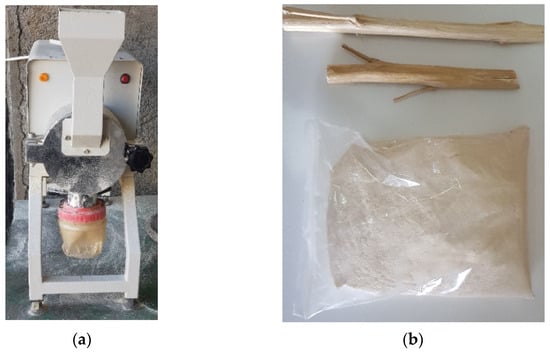 Laboratory-type mill (a) and ground biomass (b) [34].
