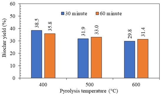 In this study, as expected, the trend identified in the main factors was also reflected in the interaction results. The highest biochar yield, at 38.5%, was obtained at a pyrolysis temperature of 400 °C and 30 °C holding time. Additionally, an increase in pyrolysis temperature caused a decrease in biochar yield, with the lowest yield of 29.8% observed at a pyrolysis temperature of 600 °C and 30 °C holding time (Figure 6).
