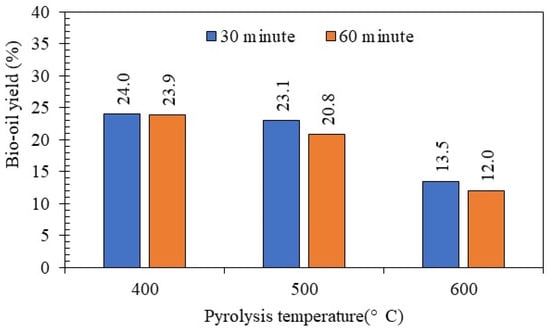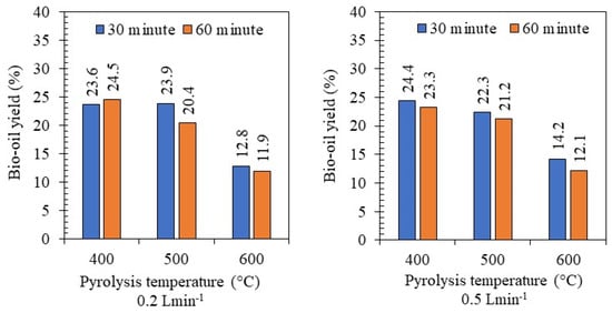 In the triple interactions, the maximum bio-oil yield of 24.5% was obtained at a gas flow rate of 0.2 L min−1, a pyrolysis temperature of 400 °C, and 60 min holding time. When the gas flow rate was increased to 0.5 L min−1, the pyrolysis temperature to 600 °C, and the 60 min holding time, the bio-oil yield decreased to levels of 12.1% (Figure 8).