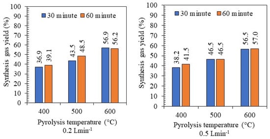The results obtained concerning synthesis gas yields in this study align closely with existing literature. Notably, an increase in pyrolysis temperature has been consistently observed to augment synthesis gas yield. For instance, Ucar and Karagöz [50] conducted an investigation into the pyrolysis efficiency of pomegranate plant biomass and documented the highest synthesis gas efficiency, 16.52%, at a pyrolysis temperature of 600 °C with a N2 gas flow rate of approximately 2 L min−1. In a separate study focusing on rapeseed oil pulp, Ucar and Ozkan [51] reported a maximum synthesis gas yield of 8.18% under identical conditions of 600 °C and a 2 L min−1 N2 gas flow rate. A similar trend was observed by Chouhan [52] in the pyrolysis of cotton stalks, where the optimum synthesis gas efficiency was also achieved at a pyrolysis temperature of 600 °C. These findings collectively underscore the critical role of pyrolysis temperature in enhancing synthesis gas yield.