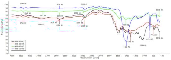 In the research, FTIR results of biomass produced at 400 °C with different holding times and gas flow rates are presented in Figure 10. In 400-30-0.2 and 400-30-0.5 conditions, biochar with lower carbon content was obtained due to shorter pyrolysis time and lower temperature. This observation aligns with the findings of Smith et al. [53], who noted that reduced holding time and temperature typically result in biochar with lower carbon content. In addition, it has been determined that 400-60-0.2 and 400-60-0.5 conditions in biochar production increase the carbon content of biochar by providing better carbonization than other production factors due to the 60-min holding time. This is in agreement with Jones and Lee [54], who found that extended pyrolysis times can enhance carbonization, thereby improving the biochar’s quality. However, between these two conditions, it is thought that a N2 gas flow rate of 0.5 L min−1 can further increase the carbon content of biochar, a hypothesis that is supported by Patel and Kim [55], who observed that higher gas flow rates can enhance biochar properties. Therefore, among the biochars produced at 400 °C pyrolysis temperature, better carbonization was achieved at 400-60-0.5 conditions. Less oxygenated functional groups were observed in biochars produced under these conditions, a finding that resonates with the research by Lee and Chang [56], who reported that reduced oxygenated functional groups are indicative of higher quality biochar.