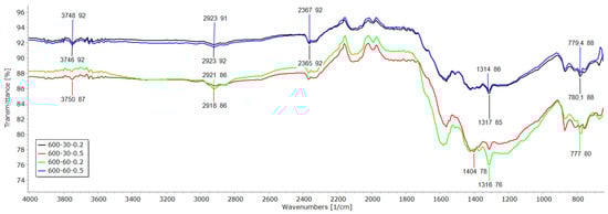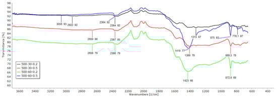 Figure 11 shows the FTIR results of biochar samples produced at 500 °C pyrolysis temperature. When the FTIR results of 500 °C are examined, it can be said that the carbonization rate of biochar produced at 500-30-0.2 and 500-30-0.5 conditions is lower. This is consistent with the observations made by Garcia et al. [57], who noted that shorter pyrolysis times at higher temperatures often result in biochar with lower C content.