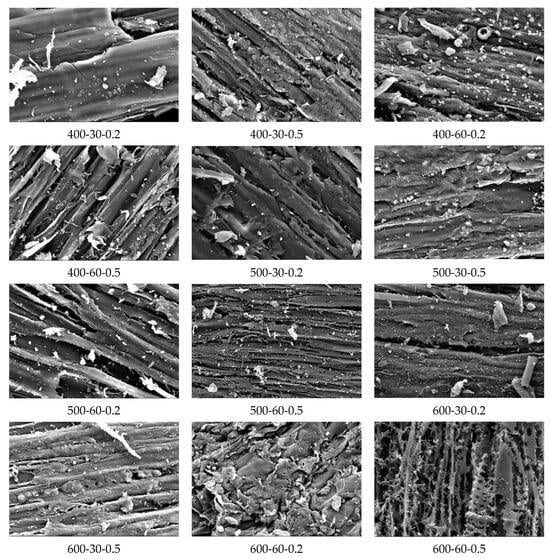 Figure 13 presents SEM images of biochar produced under various pyrolysis conditions. Upon examination of these images, it is observed that biochar produced at lower temperatures possesses a less porous structure. However, as the temperature increases, a more porous structure develops. At 600 °C, there is a significant increase in porosity. The structures observed at 600 °C are notably more disordered, and the pores are clearly larger.