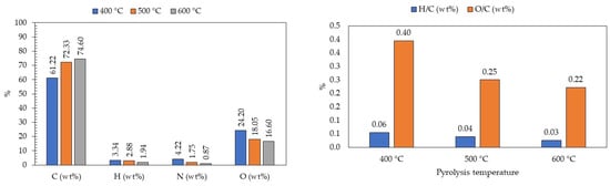 Increasing pyrolysis temperatures were linked to elevated C levels and reduced O levels, particularly evident at 400 °C, 500 °C, and 600 °C. Here, C showed a marked increase, while O demonstrated a notable decrease. This trend aligns with the findings of Mishra and Mohanty [65], who observed similar changes in biochar production under varying pyrolysis conditions. Additionally, Varma and Mondal [66] noted comparable effects in the pyrolysis of pine needles, emphasizing the influence of temperature on product yield and composition.