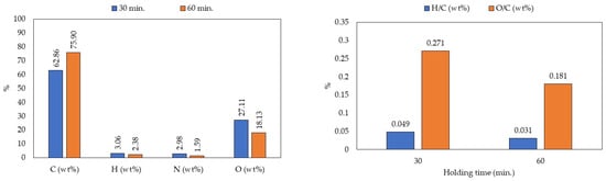 Extended holding times significantly influenced these elements, with longer periods yielding higher C and lower O concentrations. Variations in gas flow rate primarily affected C, showing an increase in concentration, while O did not exhibit a consistent pattern. Li et al. [67] explored the impact of flow rate on pyrolysis characteristics in oil shale, which may provide insights into these observations. Furthermore, Karadağ et al. [68] studied the catalytic pyrolysis of olive oil residue, highlighting the role of metal oxides in influencing the product distribution, which could be relevant to understanding the variations in elemental concentrations.