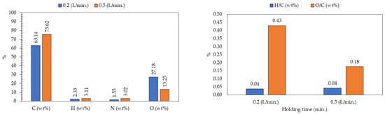 Conversely, an intriguing inverse relationship was observed regarding the H and N content in the biochar. As the carbonization temperature, holding time, and gas flow rate increased, a significant reduction in both H and N content was noted. The trend was particularly pronounced in biochar produced under specific conditions: a lower temperature of 400 °C, a shorter holding time of 30 min, and a minimal gas flow rate of 0.2 L min−1. Similar results were also observed in the studies of Volpe et al. [75]. In their studies, researchers focused on developing a downdraft gasifier using olive waste. Olive tree trimmings and pulp were subjected to pyrolysis and torrefaction processes. They observed significant mass loss and changes in elemental composition, particularly in C and H contents, at high temperatures. These findings are crucial for the effective design of the gasifier [75]. Under these parameters, the biochar displayed the highest ratios of hydrogen to carbon (H/C) and oxygen to carbon (O/C). This underscores a subtle but important interplay between the carbonization conditions and the resultant elemental composition of the biochar. This observation aligns with the findings of Yek et al. [76], who demonstrated in their study on microwave pyrolysis of waste palm shell that the process conditions significantly influence the elemental composition of biochar, particularly in terms of hydrogen and nitrogen content.