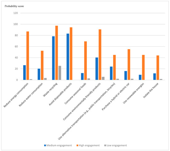 The three-subgroup solution consisted of a large (387; 59.8%) subgroup that had medium-level scores on all pro-environmental behaviors, and two smaller subgroups of individuals who reported high engagement (113; 17.5%) and low engagement (146; 22.6%) in pro-environmental behaviors, respectively. Significant differences in all 10 items were found across the three subgroups. These are reported in Table 3. Waste recycling and avoiding disposable products were the most common pro-environmental behaviors the sample engaged in, and the use of renewable energies and isolation of the house were the least common pro-environmental behaviors.