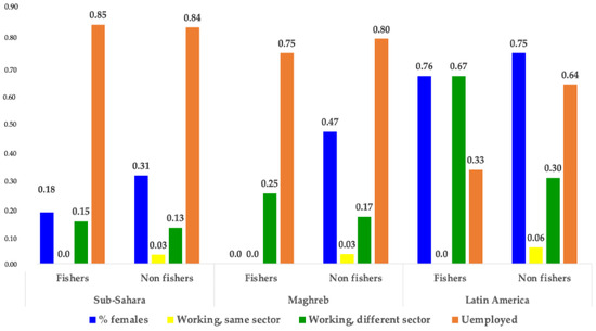 The proportion of females among fishers was 18.2% of Sub-Saharan, 0% of Maghreb, and 66.7% of Latin American fishers. For the comparison of gender ratios between fishers and non-fishers, regions were not considered separately because the sample sizes of Maghreb and Latin American fishers were small. In the total fisherfolk sample, the gender ratio was 25% females, smaller than 52.6% of non-fisher females (contingency χ1,1 = 4.93, p = 0.026; Monte Carlo p = 0.03 for 9999 permutations). No one of the interviewed migrants (nor a relative of those who gave this information) worked or had worked in the fishing sector in Spain since their arrival (sociodemographic question #2). In Spain, former fishers worked in other sectors as caregivers or salespersons, and the majority (73.3%) were unemployed (Figure 1). Many non-fishers were unemployed too (77.5%), but 20% of the employed ones worked in the same sector as in their home country (social workers, lawyers, journalists, bartenders).