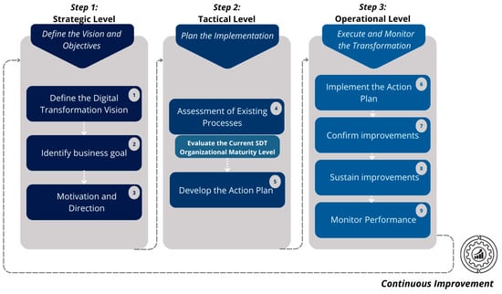 The SDT-SMEs Roadmap was developed using the ISO/IEC 33000 [46] standards family as its foundation. Initially, the roadmap’s structure was developed based on ISO/IEC TR 33014 [47], which presents a structured approach incorporating three levels of improvement: strategic, tactical, and operational. Subsequently, the sustainable digital transformation processes and dimensions were identified, and definitions for the processes and maturity model were developed to determine organizational capability and maturity levels. All processes were developed based on the literature review and discussed with researchers and experts. Following review and feedback, the development of the SDT-SMEs Roadmap was completed.