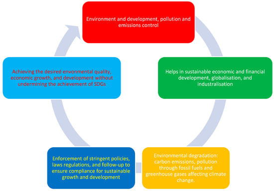 Throughout history, the global environment has experienced a significant increase in carbon emissions (CO2 and fossil fuels) since the post-World War II economic boom of the 1940s to the 1980s, primarily originating from industrialized nations [18]. In response, countries have implemented overlapping policies aimed at reducing the environmental damage associated with various activities to ensure a safe and hazard-free environment [20,21,22]. As a result, there has been a growing demand from environmentalists, scholars, policymakers, and other stakeholders to protect the environment from the adverse effects of human activities, such as excessive energy resource use, and to highlight the potential risks associated with these activities [3,9,18,22,23,24]. This demand has led to calls for the control of climate change, carbon emissions, and other forms of pollution, which have been the subject of much debate and research across various disciplines. More recently, the need for Sustainable Development Goals, as advocated by the United Nations, including the goal of addressing climate change (Goal 13) [14], has gained prominence. Moreover, the need for environmental sustainability has increased the importance of pollution and emission control [1,2,16,19,25]. This can be achieved through the implementation of stringent emission and pollution control measures, such as tax policies, penalties (fines), and the transition from non-renewable to renewable energy sources, which can only be achieved under a strong and guaranteed environmental control policy framework, as suggested by various researchers [16,26]. The growing transition to renewable energy consumption for a healthier environment is a pathway towards making the global environment sustainable [16,27]. Sustainable Development Goals include affordable and clean energy (goal 7) and action to reduce the impact of climate change (goal 13) to enhance environmental quality with adequate control [14]. At the country level, financing and maintaining environmental quality should start with yearly budget allocations, governance, and other environmentally related policies that can help improve the quality of the environment [28]. Researchers have revealed that rapid global economic growth, with rising industrialization, globalization, and financial development, has triggered the rate of carbon emissions [16,29]. Ref. [30] averred that part of control could be attributed to the reducing consumption of non-renewable energy such as coal and fossil fuel.