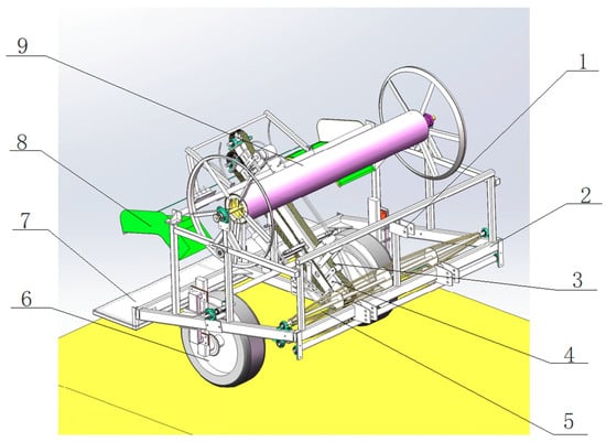 The 3D diagram of the small arch shed recovery machine. 1. Tractor three-point suspension. 2. Complete machine rack. 3. Synchronous toothed belt. 4. Collection stop mechanism. 5. Film spread roll. 6. Walking wheel. 7. Operating platform. 8. Pole storage table. 9. Membrane-collecting mechanism.