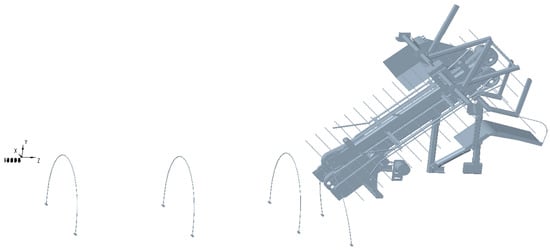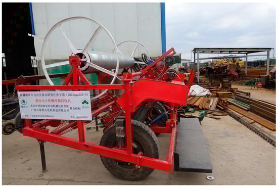From 16 to 17 May 2024, the experimental demonstration of the cotton small arch shed film-recycling machine was carried out in Laowan Town, Shawan City, Tacheng District, Xinjiang Uygur Autonomous Region, China. An on-site cotton small-arch-film-recycling mechanized technology meeting was held, and the machine and tools were tested on-site. The test instruments include a steel tape ruler, an angle ruler, a stopwatch, and so on. According to the agronomic conditions of cotton arch shed planting, the working parameters of transplanter were set to match with the appropriate planting distance and planting row distance. In this test, the agronomic parameters of the arch shed were as follows: shed height 700 mm, shed width 900 mm, and shed pole array spacing and row spacing 1100 mm. The section diameter of the pole is 6 cm, the length of the pole is 170 cm, and the material is glass fiber. The arch film used is a white plastic film covering with a width of 1200 mm and a thickness of 0.015 mm. The working test of the small-arch-shed-recycling machine is shown in Figure 8, and the effect diagram after recycling the arch shed is shown in Figure 9.