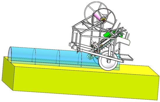 The whole machine can be suspended and pulled by a tractor, and the whole machine is composed of a frame, a mechanical transmission mechanism, a hydraulic transmission system, a film-receiving mechanism, and a rod-closing mechanism. The specific three-dimensional structure is shown in Figure 1, and a physical picture is shown in Figure 2. The whole arch shed is recovered in length, width, and height (2450 mm × 1700 mm × 1800 mm). The rubber ground wheel drive method is used in the roll film recovery link through the ratio of reduction gear, matching the appropriate tension to pull the film, not only to ensure that the film is fast in the process of rolling back, but also providing moderate tension, having a single layer of film in the roll back to maintain flatness, and ensuring the gap between the layers to prevent aging [,].