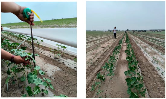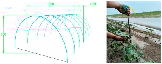 The agronomic parameters of the small arch shed used to cultivate cotton are shown in Figure 2. The shed height is 700 mm, the shed width is 900 mm, and the shed pole array spacing and row spacing are both 1100 mm. A white covering with a width of 1200 mm and a thickness of 0.015 mm is used. The actual planting agronomy model and the field planting agronomy are shown in Figure 4.