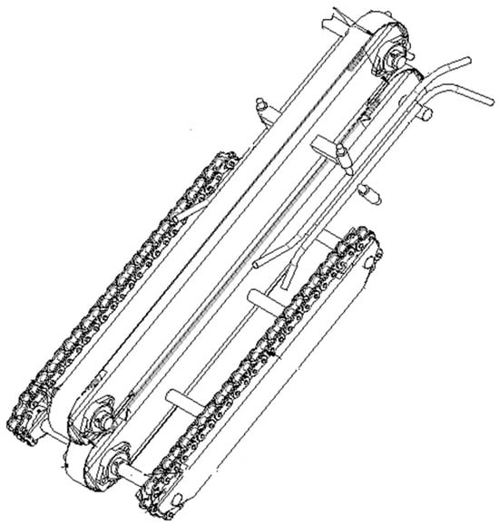 The structure of the clamping and pulling device of the arch bar is shown in Figure 5, which is mainly composed of a clamping device, synchronous toothed belt, tension device, limit plate, and other parts. The function of the clamping device is as follows: when the closing mechanism travels at a certain speed on the arch, the arch pole is clamped and pulled up along the synchronous toothed belt and transported to a predetermined position for collection. The forward speed of the arch shed recovery machine must be equal to and opposite to the horizontal speed of the speed of the clamping synchronous toothed belt, so as to ensure that the arch shed rod is pulled up vertically, as shown in Figure 6. The clamping device is comprised of a double-row clamping chain, a double-row sprocket, and a clamping chain drive shaft.