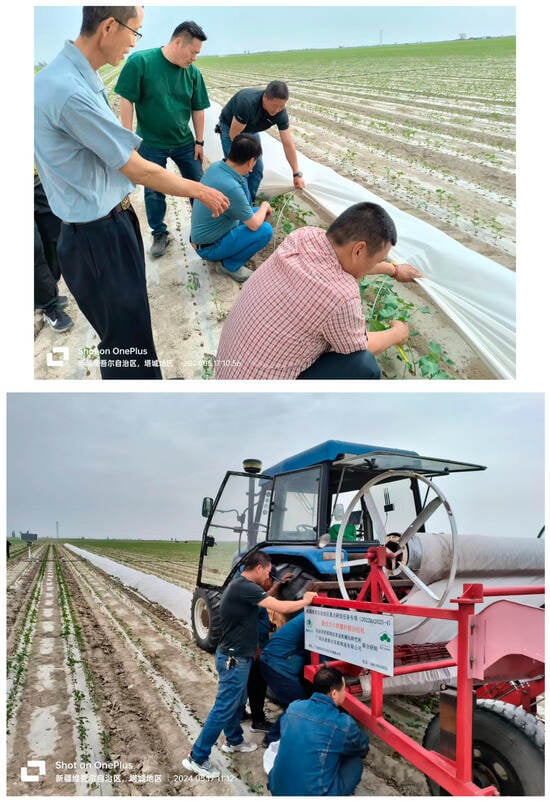 The working test of the small-arch-shed-recycling machine. (Text on label: Xinjiang Uygur Autonomous Region Key Research and Development Special, Hanging Small Arch Shed Recycling Machine).