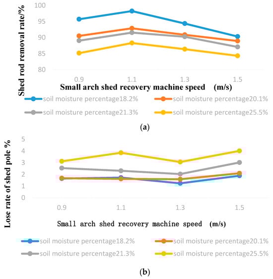 A single-factor analysis was performed based on the data from the field experiment. Figure 10a–d show the analysis results. In the dryland soil with a water content of 18.2~25.5%, the running speed and mechanical speed increased, the removal rate of the shed rod increased, the removal rate of the shed rod and the shed film net increased first and then decreased, and the seedling injury rate decreased first and then increased. When the machine speed is 1.1 m /s, the shed rod leakage rate and seedling injury rate are the lowest. At this time, the removal rate of the ceiling rod and the removal rate of the ceiling film are the highest, which are 95.72% and 98.63%, respectively.