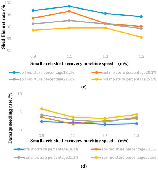 Plots with different water contents were selected for the test (25.5%, 21.3%, 20.1%, and 18.2%). At the beginning of the test of the small arch shed recovery machine, the effects of the machine walking speed of 0.9 m/s, 1.1 m/s, 1.3 m/s, and 1.5 m/s on the removal rate of the shed rod, the removal rate of the shed film, and the damage rate of the seedlings were measured, and the reasons were analyzed. The specific test data table is shown in Figure 10a–d.