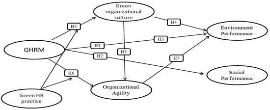 Businesses that can swiftly adjust their internal structures, reorganize their resources, and respond to changes in the market are more likely to be innovative and adaptable. Khokhar [] stated that this capability is supported and enabled by very high-quality resources. Therefore, how a company uses these resources is a vital issue to the success of a business and its ability to grow and succeed in a chaotic setting. There is a dearth of data from actual studies on the ways in which environmental factors impact the development of agility and performance in companies, despite the fact that organizational agility is a key component in determining a company’s competitive advantage [], right alongside strategic directivity. According to Begum [], businesses that are agile are better able to plan, organize, and manage their sustainability goals from a social, economic, and environmental standpoint. OA boosts the performance of the whole firm, according to the literature. We argue that, according to the research, firms may improve their EP by being nimbler and implementing green initiatives throughout the company. Because they are seen to care about the environment, people are more inclined to think highly of firms that adopt GHRM. People are more inclined to be lured to environmental groups that are associated with prominent figures since doing so boosts their self-esteem []. Employees also prefer to work for these companies since they care more about their development as people and as workers [,]. On the other hand, OA is more likely to flourish in companies with great reputations that employees seek out such companies. OA guarantees that GHRM action directly impacts on EP in different ways, such as selecting green materials, reporting immediately, and being concerned about environmental impacts. Supporting the hypothesis with actual evidence, a link between GHRM and the attractiveness of candidates was established in a study conducted by []. This study advocated for a work environment in which employers actively support employees’ professional growth and development to better prepare them for life’s unexpected challenges [,]. Company initiatives that go above and beyond what is required by law and regulation are known to have EP [,]. This type of performance is crucial because it ties into CSR, which in turn makes customers hold the company accountable [,]. While staying in compliance with regulatory environmental requirements, it encompasses the consequences of organizational activities, products, and resource usage on the environment []. With the help of GHRM, companies may develop an all-encompassing strategy to boost their environmental performance through recruiting incentives, an employee empowerment programmer, and other methods. Based on the information provided, we may propose the following hypotheses: